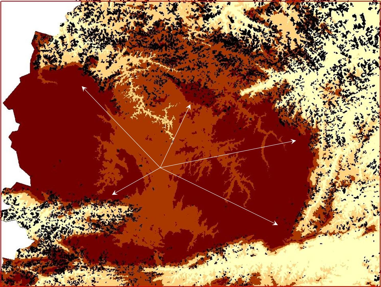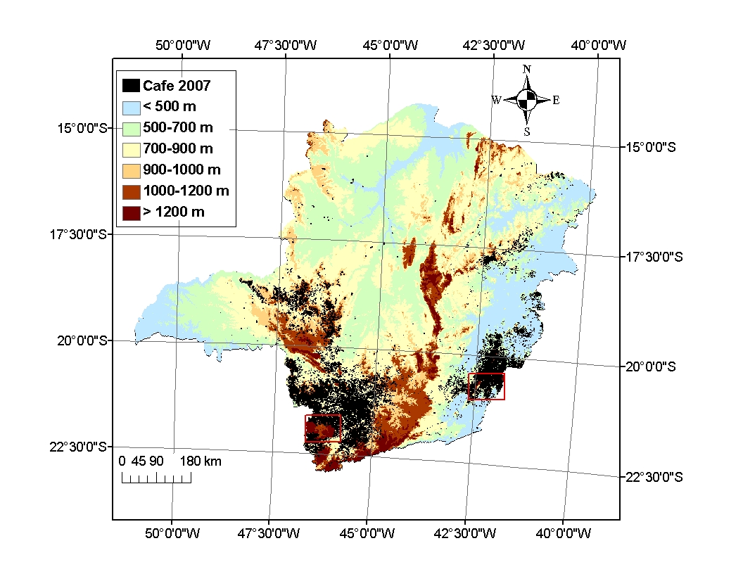 The State of Minas Gerais is the major coffee producer in Brazil. The crop is spread over different environments as wellas different management systems. Knowledge about environmental variables helps to establish and define appropriate managementpractices for the coffee crop. The objective of this study was to access spatially and quantitatively the occupation of coffee crop in MinasGerais and to elaborate a land use model for coffee crop in the state taking into account variables such as soil type, altitude, slope andaspect. We have used remote sensing data to map coffee areas and to derive relief data (altitude, slope and aspect). The relief data anda digital soil map were overlapped with the coffee area map in order to access the prevailing relationships. We have also consideredthe most favorable classes of each theme to determine the most suitable environment for coffee crop. Results show that the crop isdistributed within altitudes varying from 500 to 1.200 m. There are coffee fields in all classes of slope but slopes up to 15%predominate. The aspect does not seem to influence the occurrence of coffee since the proportions of coffee fields are about the samein all classes. However, we have found a slightly smaller proportion of coffee placed in west-facing slopes. In relation to soil types,Latossolos and Argissolos are the most occupied with coffee, that is, up to 80% of coffee fields are placed in those soils. About 70%of coffee fields are spread in appropriate environments over the best classes of soil, altitude, slope and aspect.