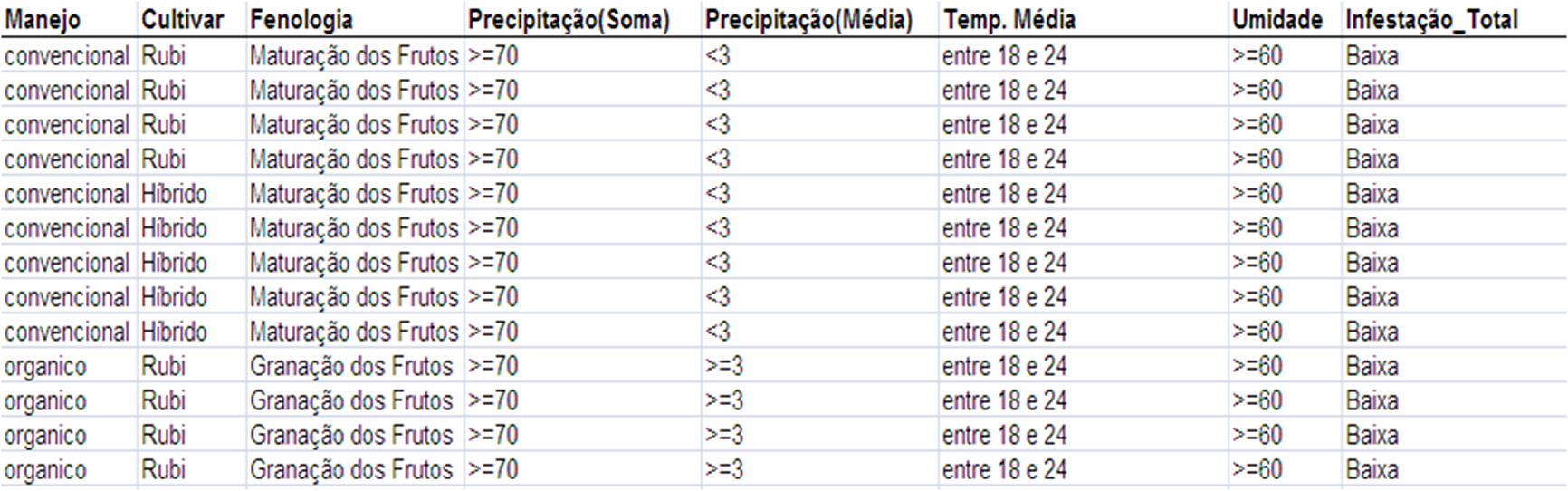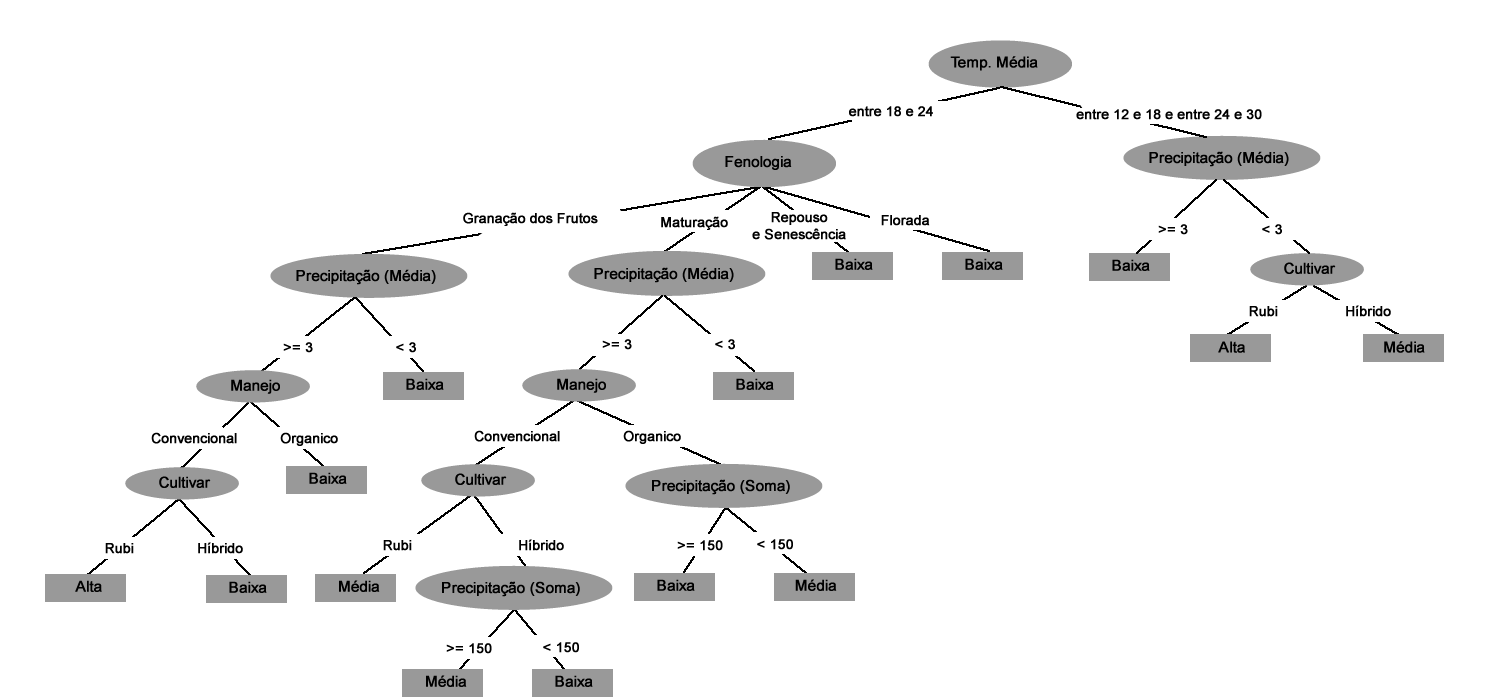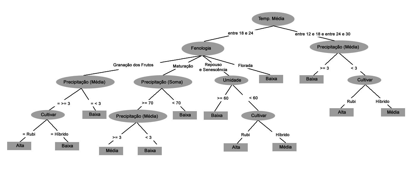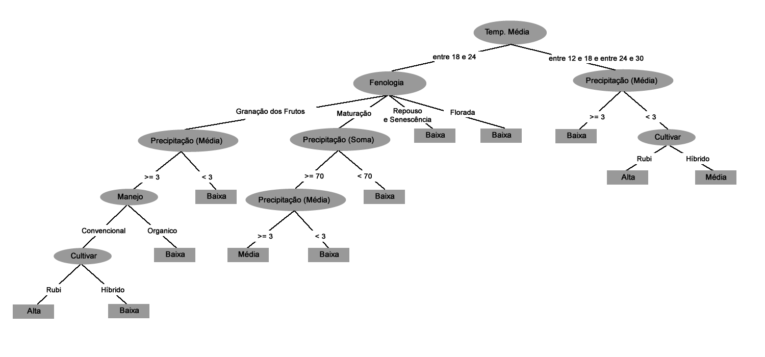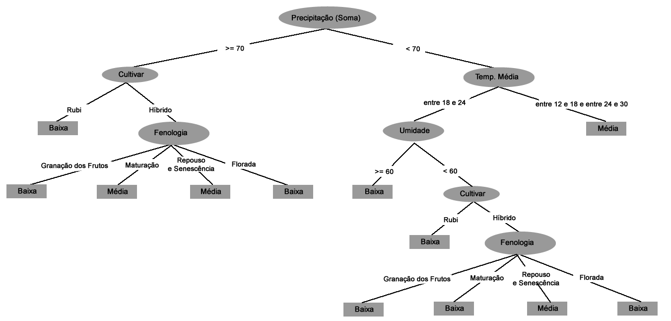 The survey of the progress of Cercospora leaf spot becomes potentially useful and understandable in understanding the disease process and in decision making for control measures. In the last years, computer programs have helped to elucidate what factors are biotic or abiotic more representative. The aim of this work was to investigate, using knowledge extraction techniques, which phenological and environmental attributes most influence on the occurrence of Cercospora leaf spot on coffee trees in southern Minas Gerais, under two tillage systems: conventional and organic. For this, data were organized incidence of Cercospora leaf spot in both cropping systems, with climatic data and phenological crop in a period of five years of evaluation. Then an algorithm based on knowledge extraction decision tree was used to obtain the attributes that most favor the occurrence of Cercospora leaf spot. The generated models were 60% hit rate and showed that the average temperature of the attribute was greater influence on the entire data and the conventional culture system. In organic management, the precipitation and phenology are the factors that most influence the occurrence of disease.Published