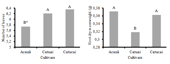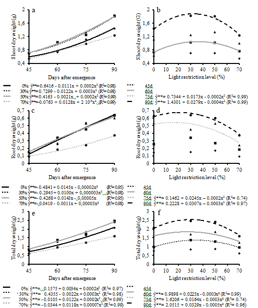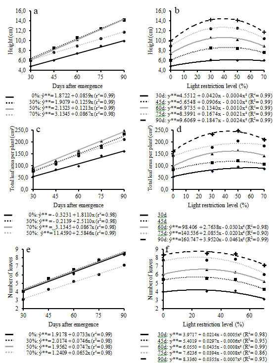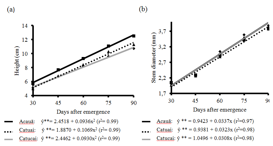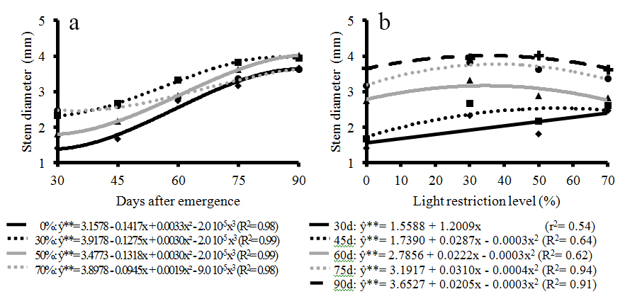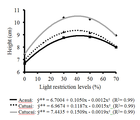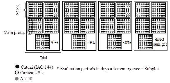 development assessments began 30 days after emergence and were conducted at 15-day intervals until 90 days. The light restriction levels and assessment periods, as well as the interaction between those factors, affected all the growth characteristics evaluated. With the exception of stem diameter, all other growth parameters had similar behavior in relation to the number of days after emergence and levels of light restriction. In general, the morphological changes in the initial growth of the coffee plantlet were more intense under light restriction values from 30% to 50%, and Catucaí 2SL presented greater development in comparison to Catuaí (IAC 144) and Acauã.