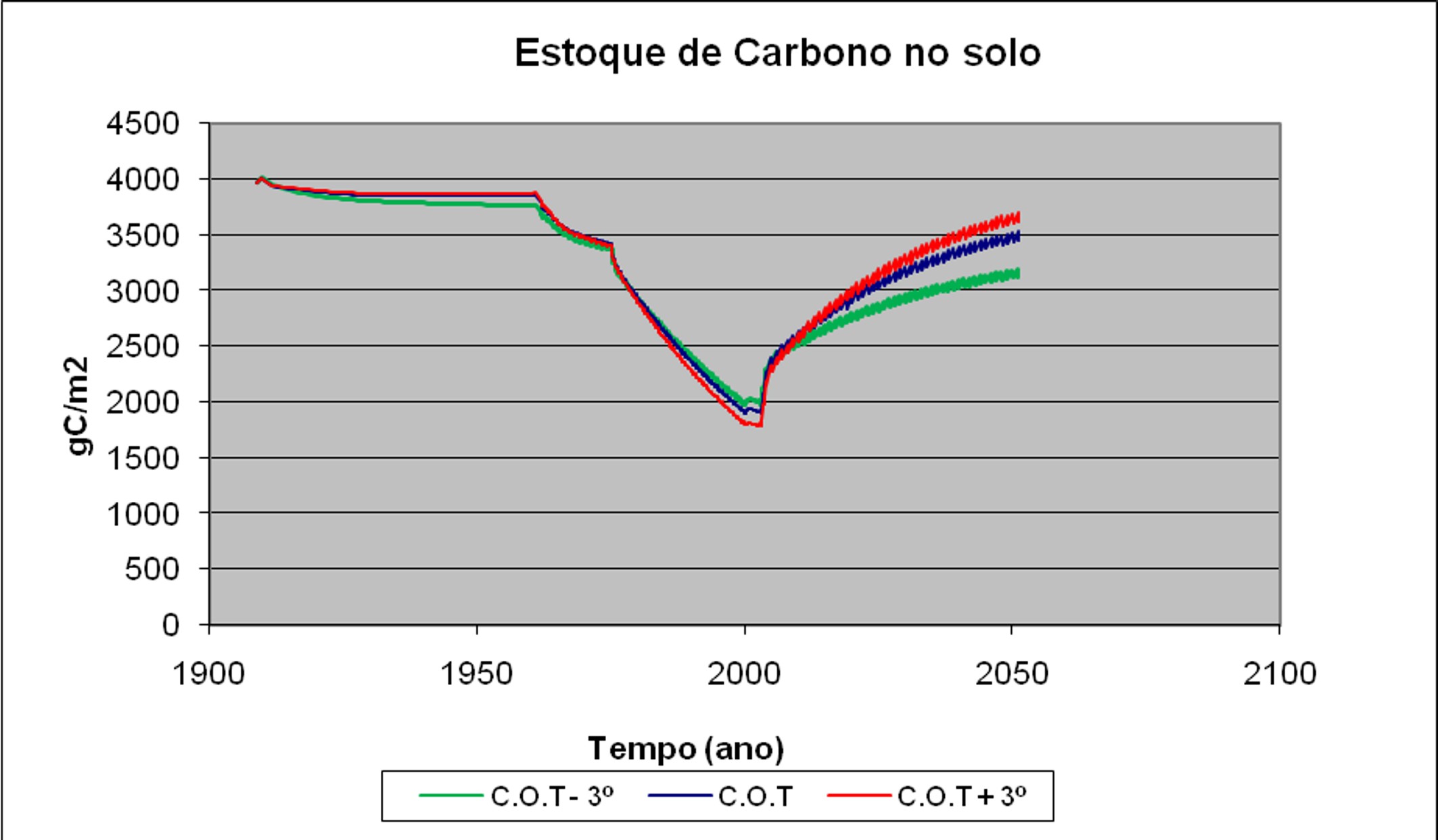 in the southern state of Espírito Santo, this study aimed to simulate, using the Century model, the impact of conilon coffee’s growing on C stocks in the southern region of Espirito Santo’s soil. Based on the IPCC forecast was estimated the impact of rising temperatures in the region on C stocks in the soil. The study was conducted in an experimental area of the Federal Institute of Espirito Santo (Ifes), Alegre. The simulation of the dynamics of organic matter and nutrients was performed using the Century model. It was used climate, management, fertilization and production data of the studied area. There was a significant change in C stocks, with the increase and the decrease of the average temperature, showing variation of 3.7% and 2.7% in the C stock.