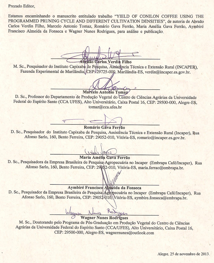 PAULO, E. M.; FURLANI JÚNIOR, E. Yield performance and leaf nutrient levels of coffee cultivars under different plant densities. Scientia Agricola, Piracicaba, v. 67, n. 6, p. 720-726, 2010.