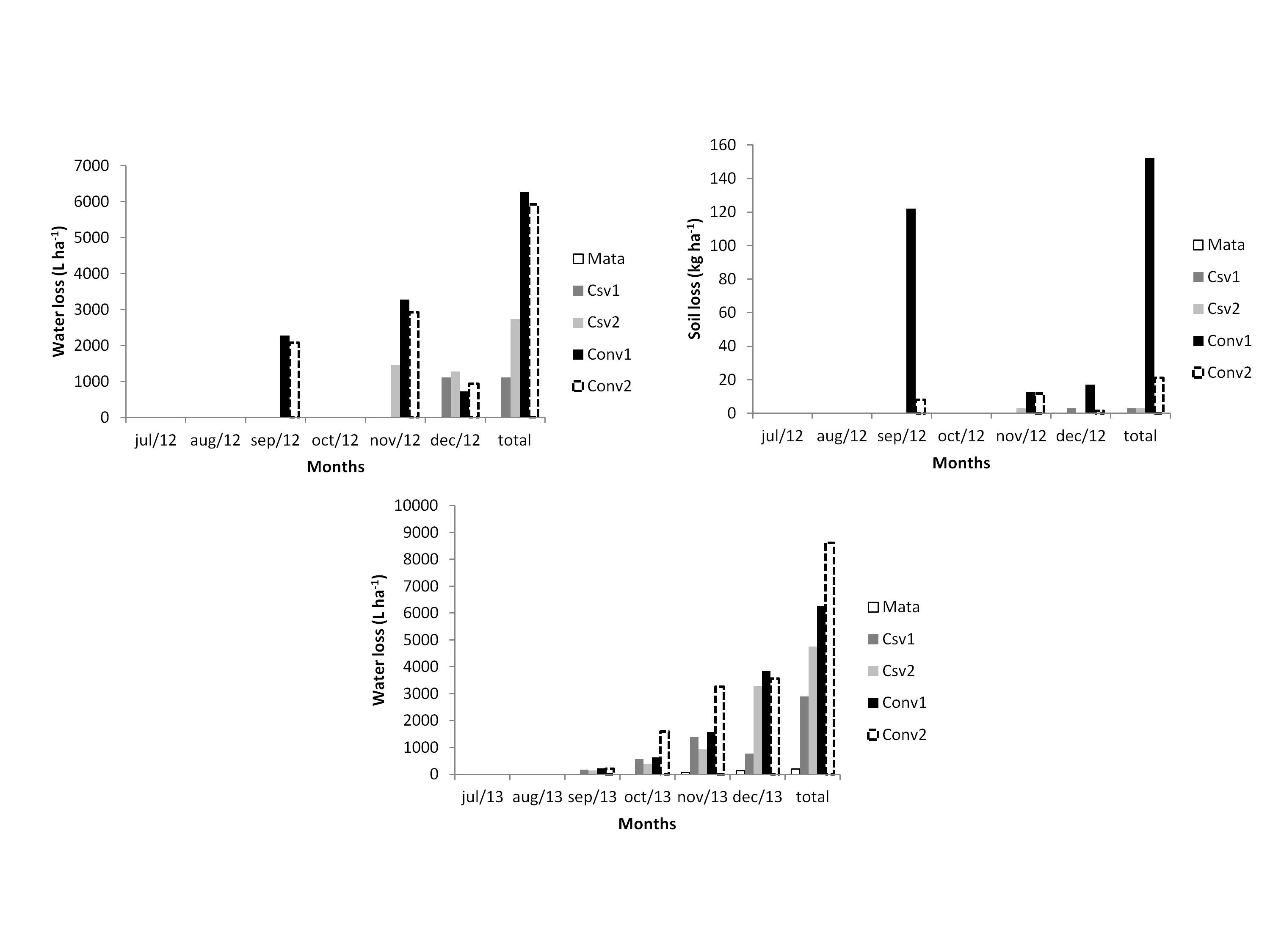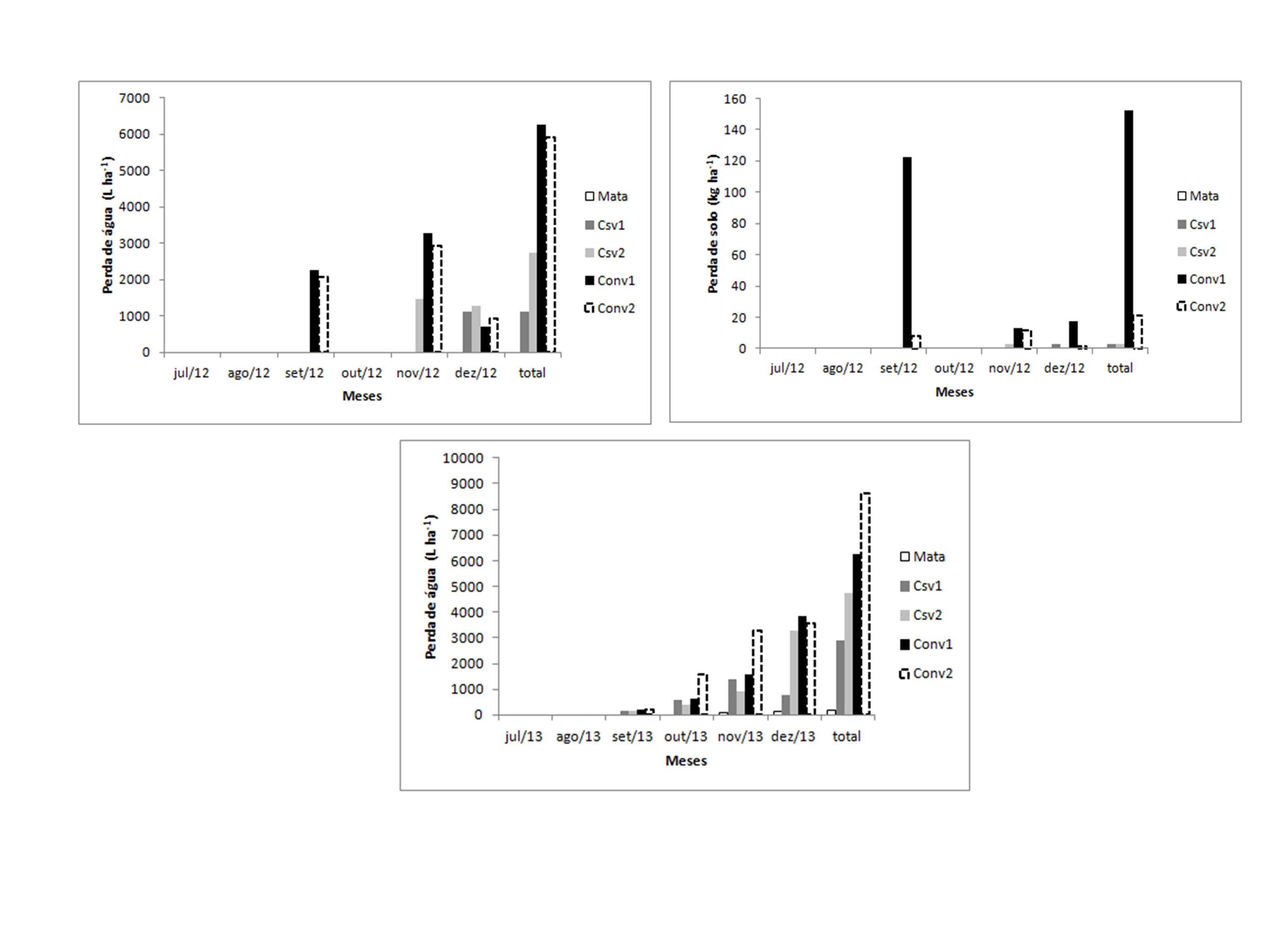 This study aimed to evaluate the losses of soil, water, carbon (C) and nitrogen (N) and the compartments of soil organic matter (SOM) in coffee systems belonging to the Atlantic Rainforest biome south of state of Espírito Santo. Four coffee agroecosystems were evaluated: conservationist 1 (Csv1), conservationist 2 (Csv2), conventional 1 (Conv1), conventional 2 (conv2) and field of Atlantic Forest (Mata). Evaluations of loss by water erosion under natural rainfall condition were carried from july to december 2012 and 2013. Soil samples were collected at 0-10 and 10-20 cm for evaluation of TOC, NT and compartments of SOM. The results showed that precipitation of 540,8 mm occurred during the 6 month of evaluation in 2012 promoted losses water in 1110, 2740, 6270 and 5930 mm ha-1 for Csv1, Csv2, Conv1 and Conv2, respectively, since soil losses for these respective systems were 2,87; 2,85; 152,13 and 21,17 kg ha-1. For precipitation of 669,4 mm occurred during july to december 2013 the water total losses were 203, 2900, 4750, 6270 and 8620 mm ha-1 for Mata, Csv1, Csv2, Conv1, Conv2, respectively. Conventional systems showed total average loss of 3363 g C ha-1 and 282 g ha-1 of N in the soil eroded in 2012. Conservationists systems showed C levels of microbial biomass pool 253 times higher compared to conventional systems in the 0-10 cm depth.