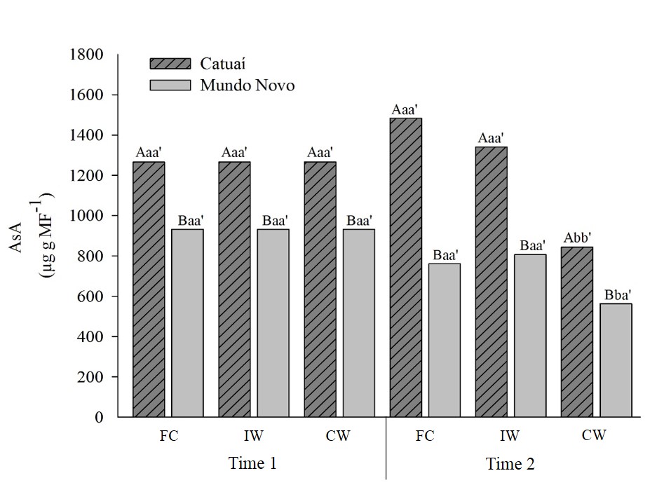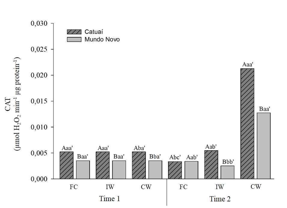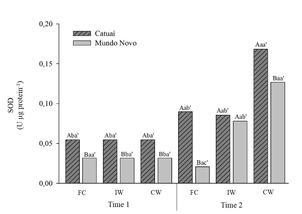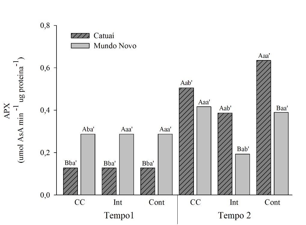 We investigated the response from antioxidant system of Coffea arabica L. seedlings from Catuaí and Mundo Novo cultivars to waterlogging. For this, acclimated seedlings with eight pairs of completely expanded leaves were submitted to three conditions of water availability: field capacity, intermittent waterlogging and continuous waterlogging. The evaluations were performed at the beginning of the experiment and five months after waterlogging. Activity of antioxidant enzymes and levels of ascorbate were evaluated. There was a response of enzymatic and non-enzymatic antioxidant system of coffee seedlings to stress condition, allowing the plants to survive under waterlogging for 150 days. The antioxidant system was more active in Catuaí than in Mundo Novo cultivar.